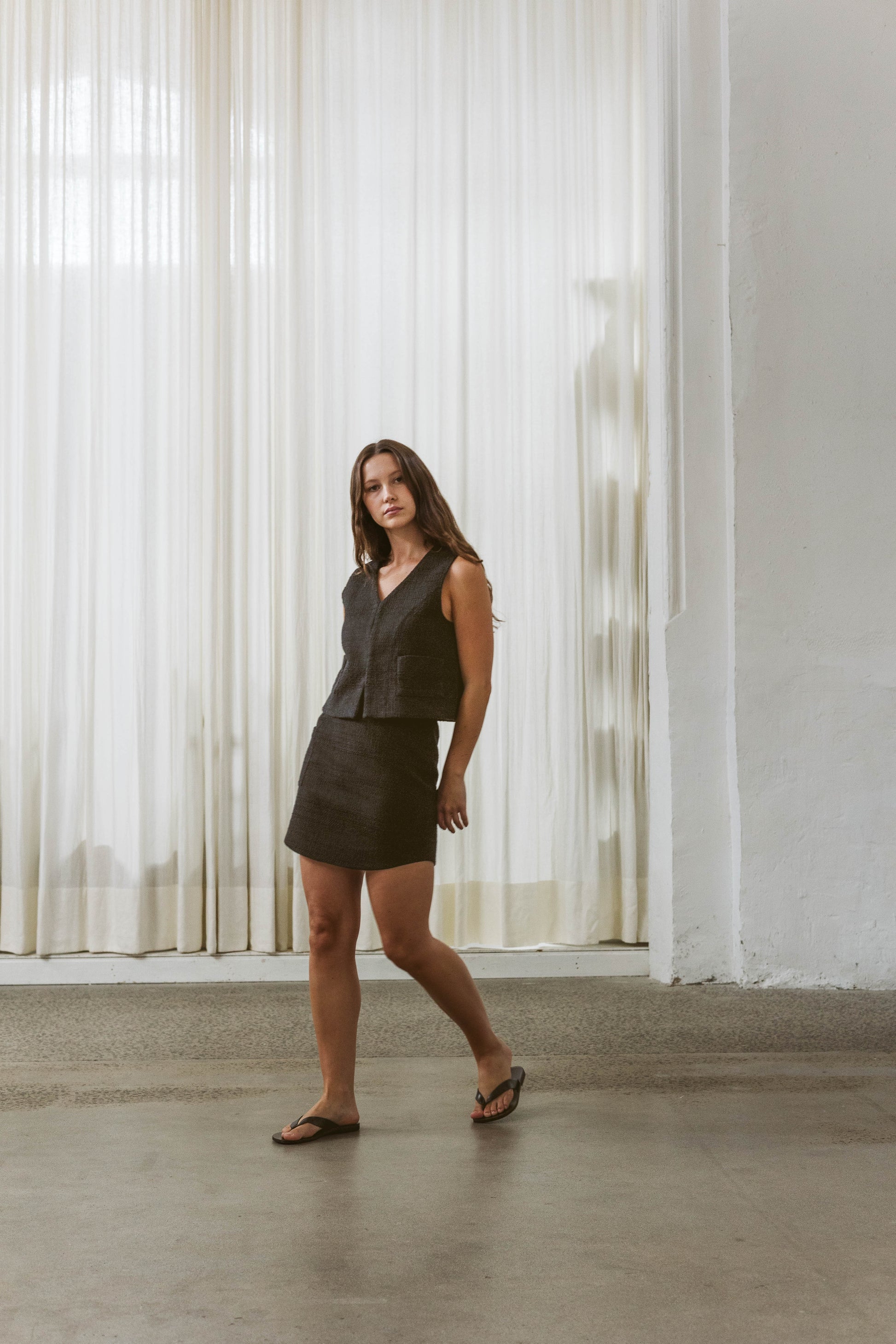 The Cotton Mini Skirt is crafted in a luxurious woven tweed cotton fabrication, with a zip fastening. The Cotton Mini Skirt has a slight curve along the hem line, sitting mid-thigh. A wearable, layering piece that can be styled from day to night.